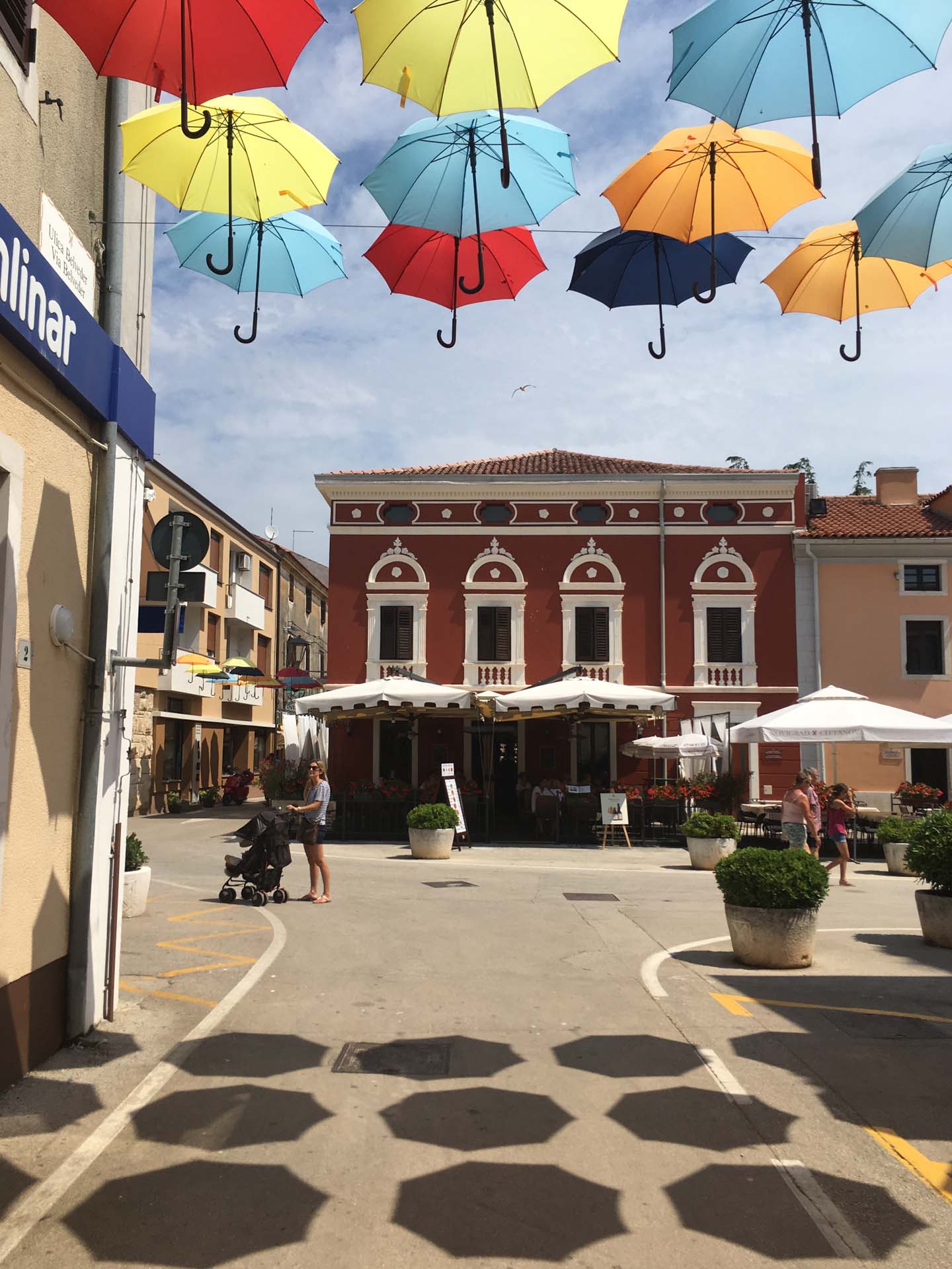 Schliesslich fuhren wir noch in ein Hotel in Porec. Das war auch gut. Zuerst machten wir noch einen Halt in Novigrad, wo der Himmel zwar nicht voller Geigen, aber immerhin voller Sonnenschirme hing.